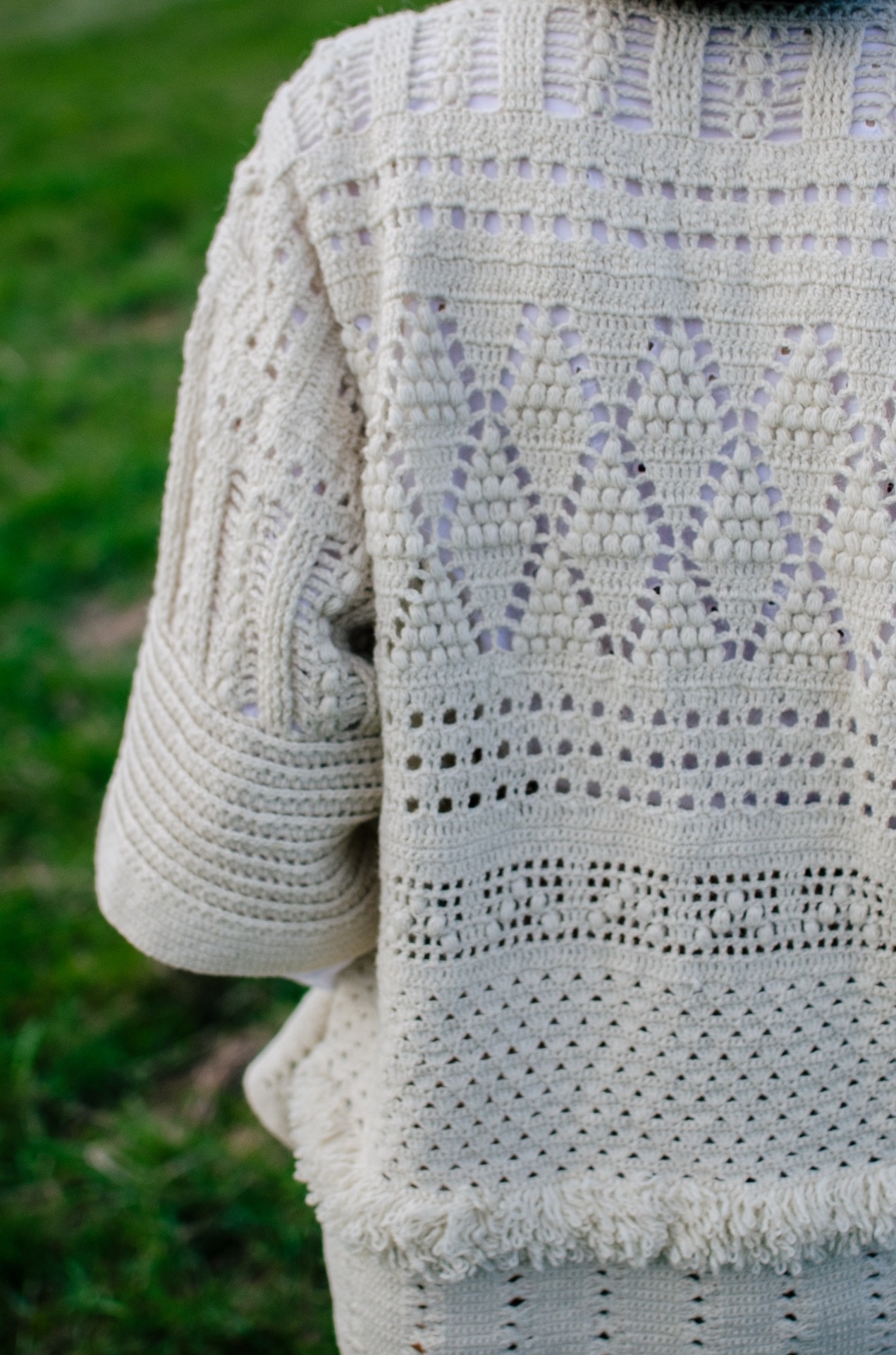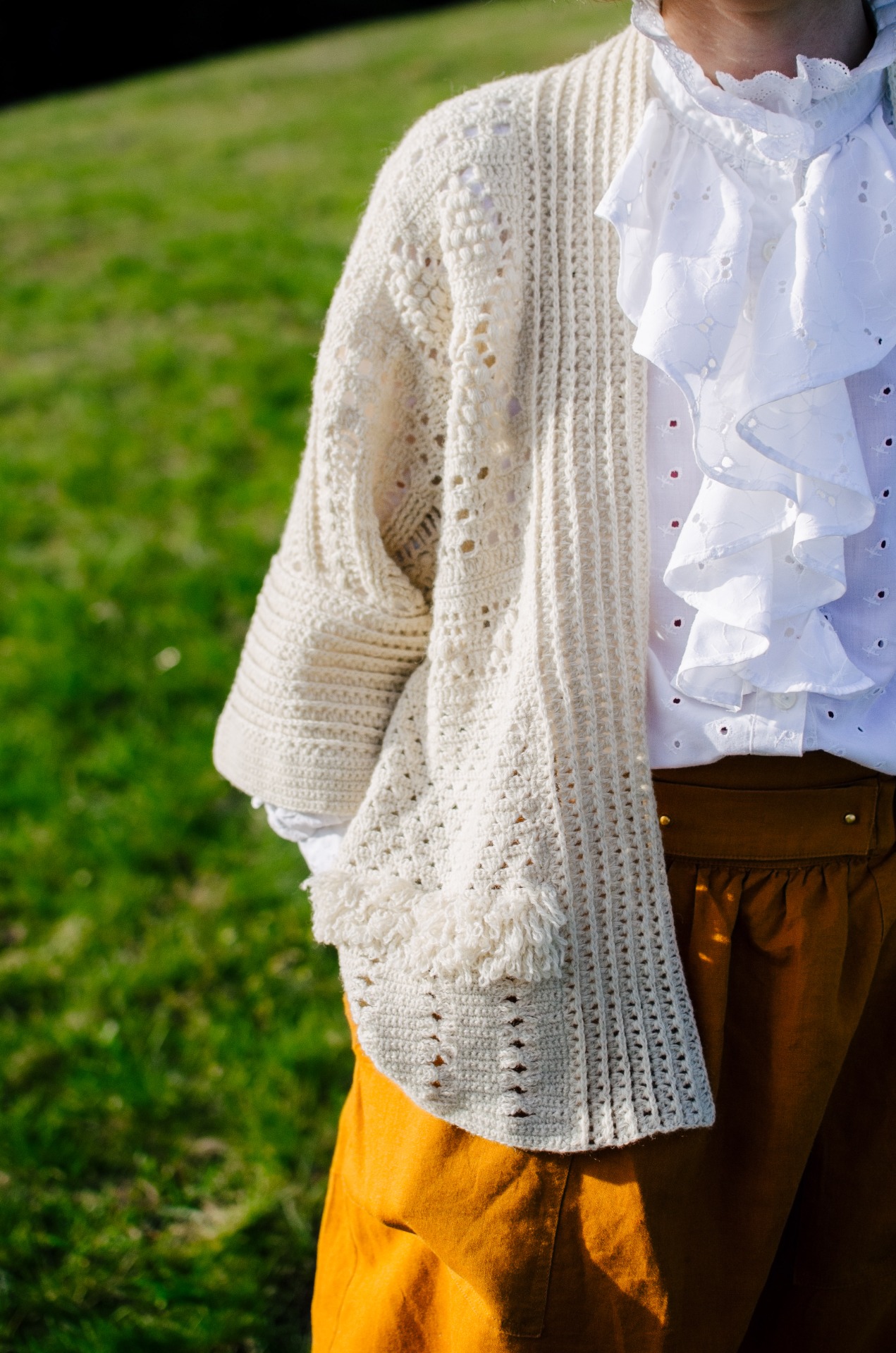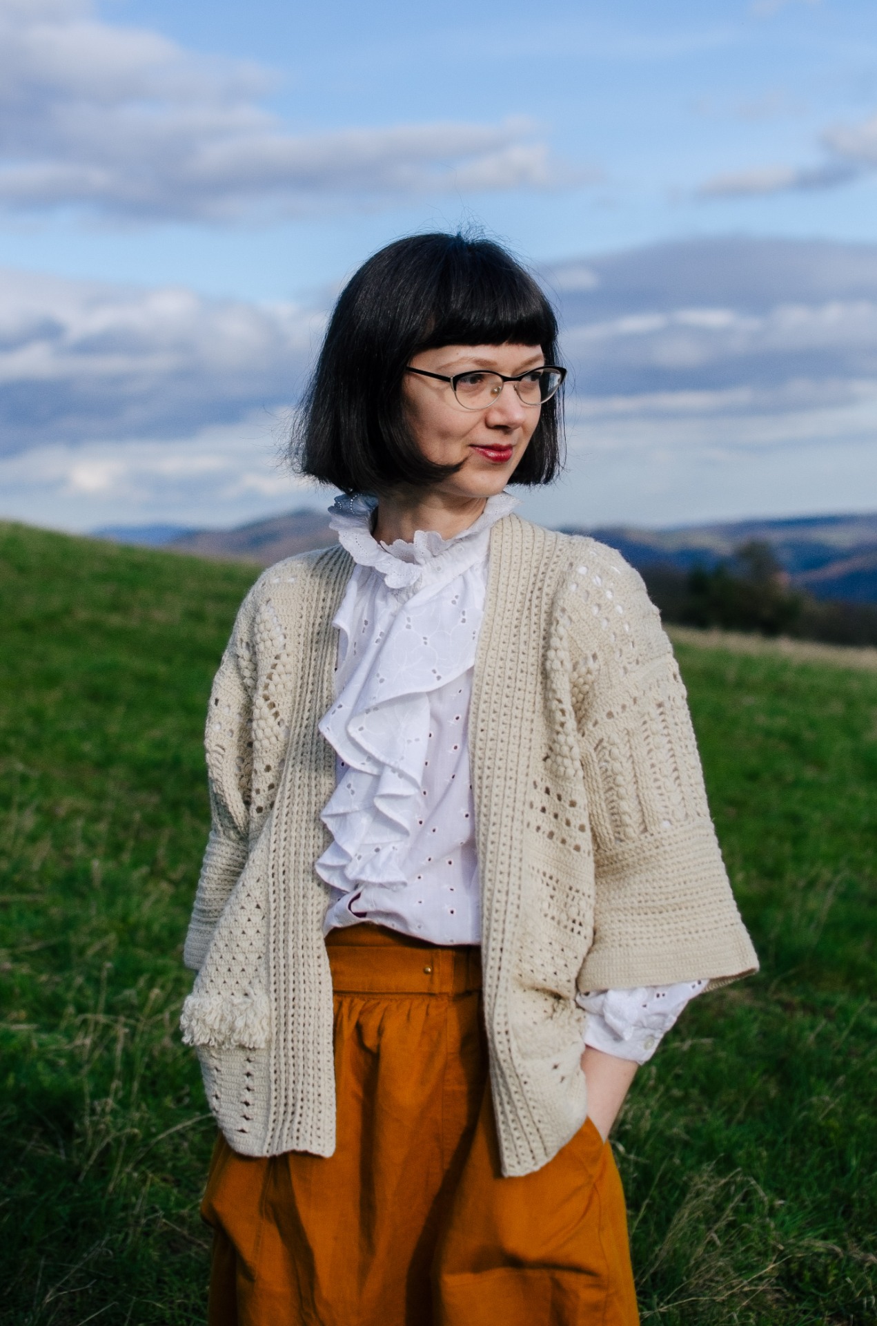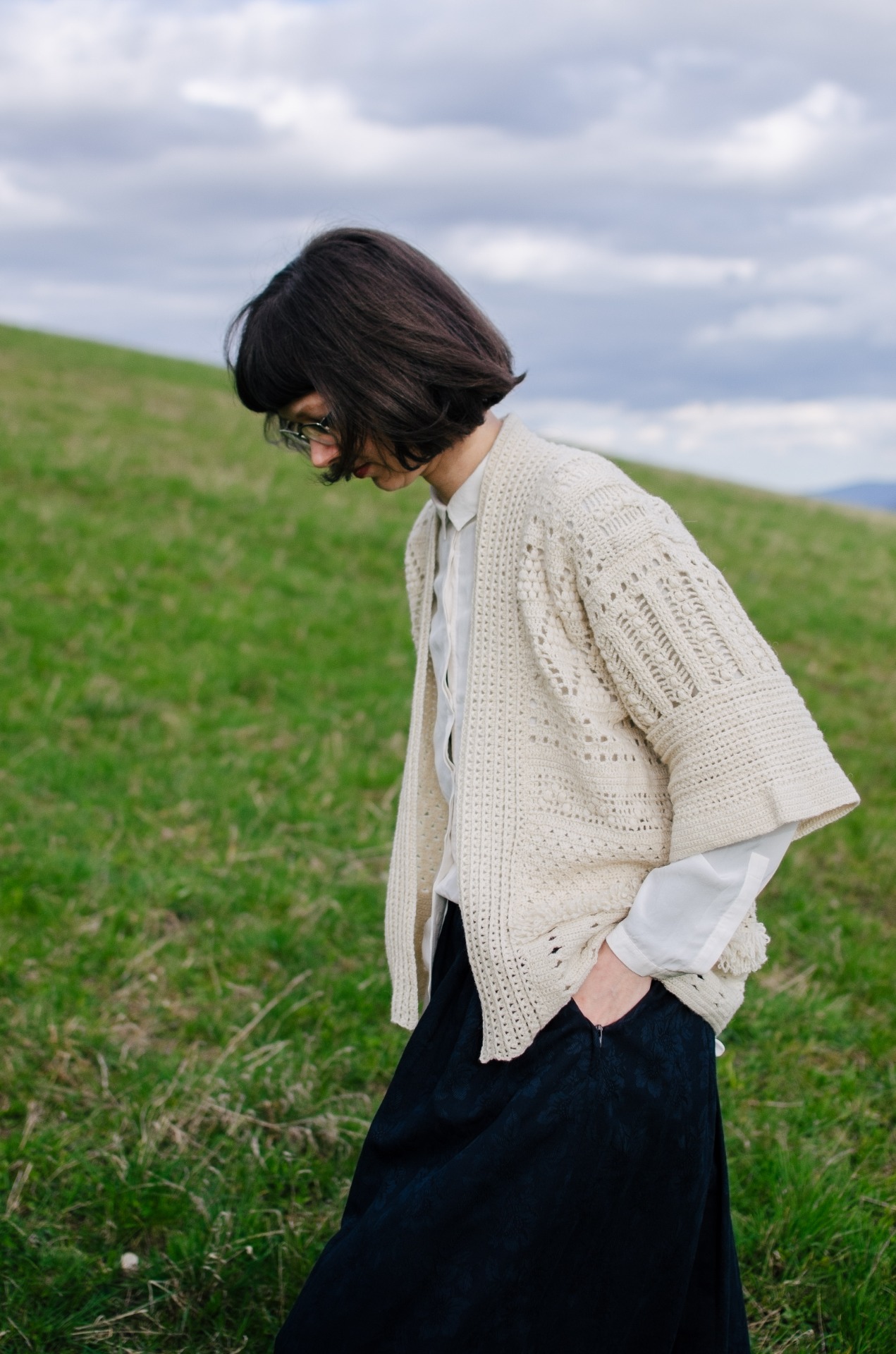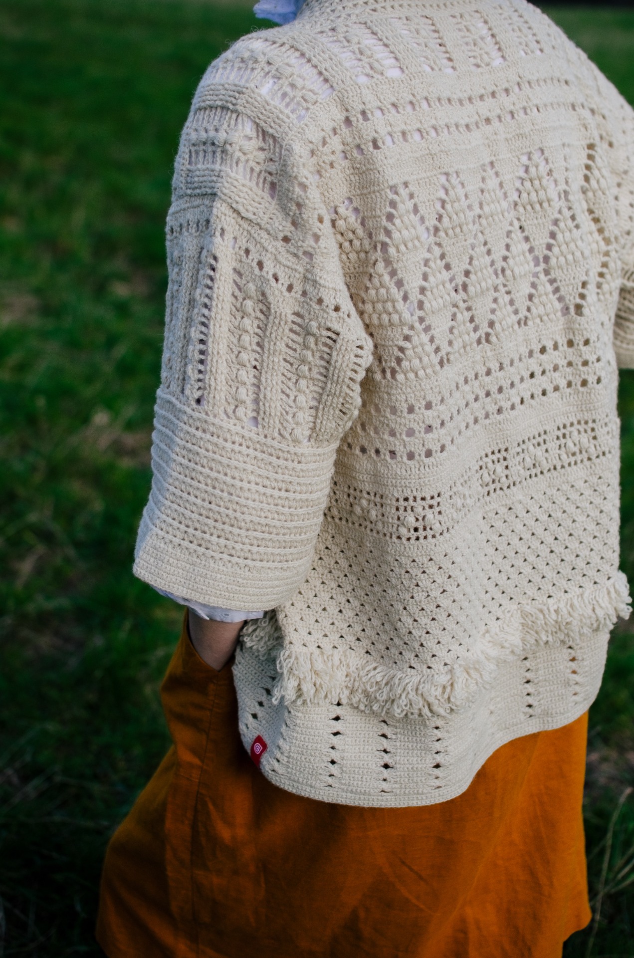 Kardigán je háčkovaný z dvojnitky od ovečiek zo stáda pani Milany z Močiara a z Farmy Na Háji. Spriadané v Poľane Lučenec a vo Vlnárskej Manufaktúre Senohrad.