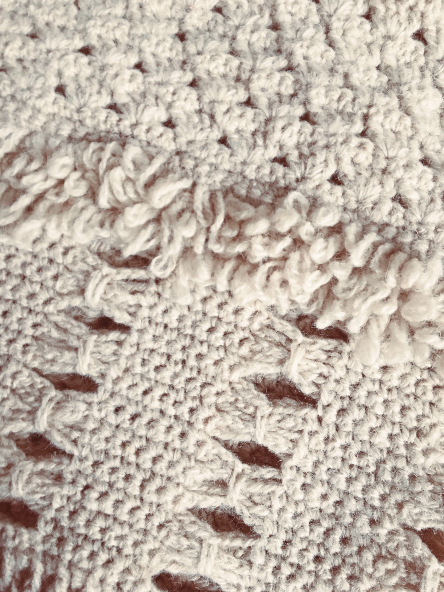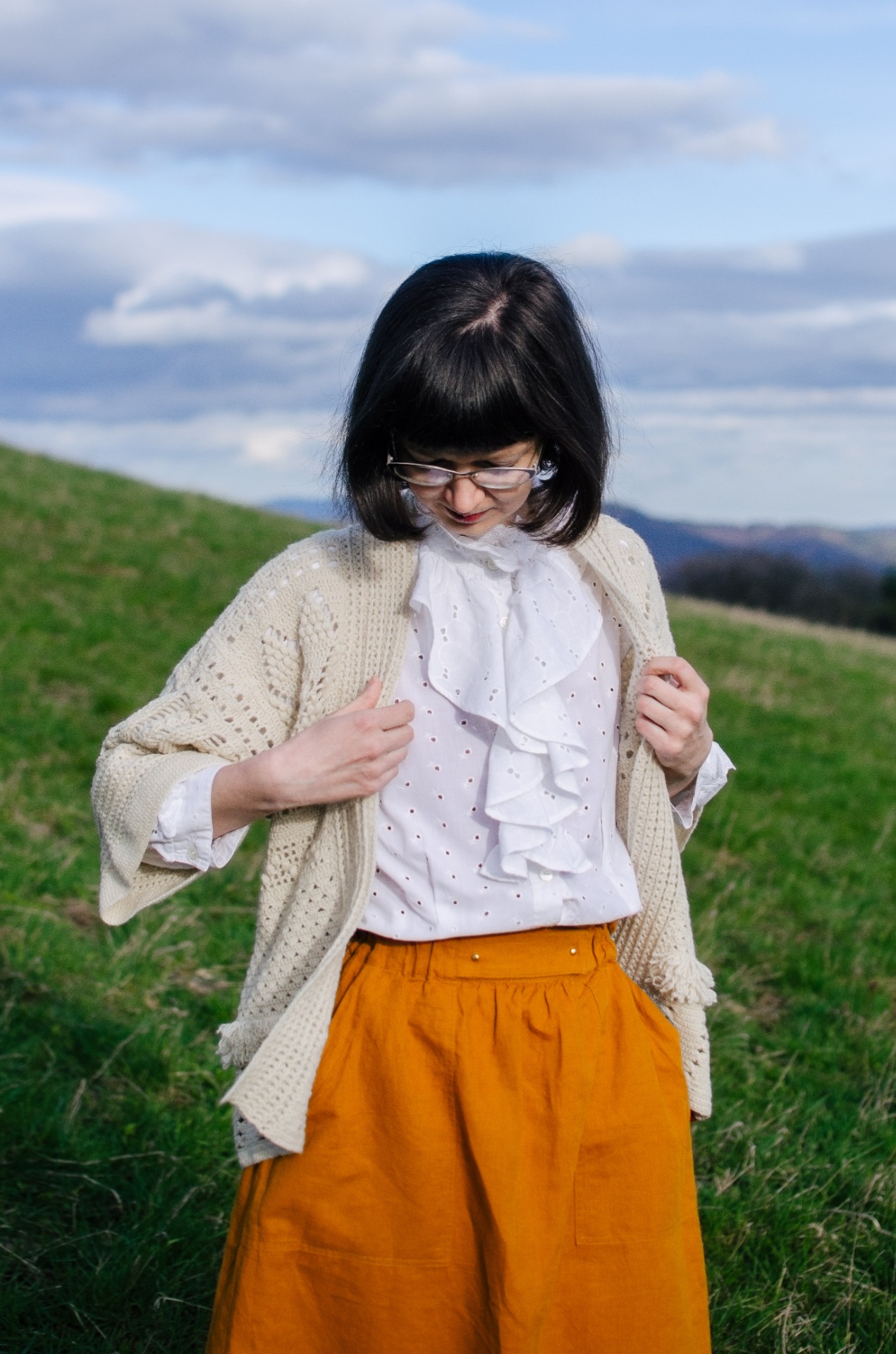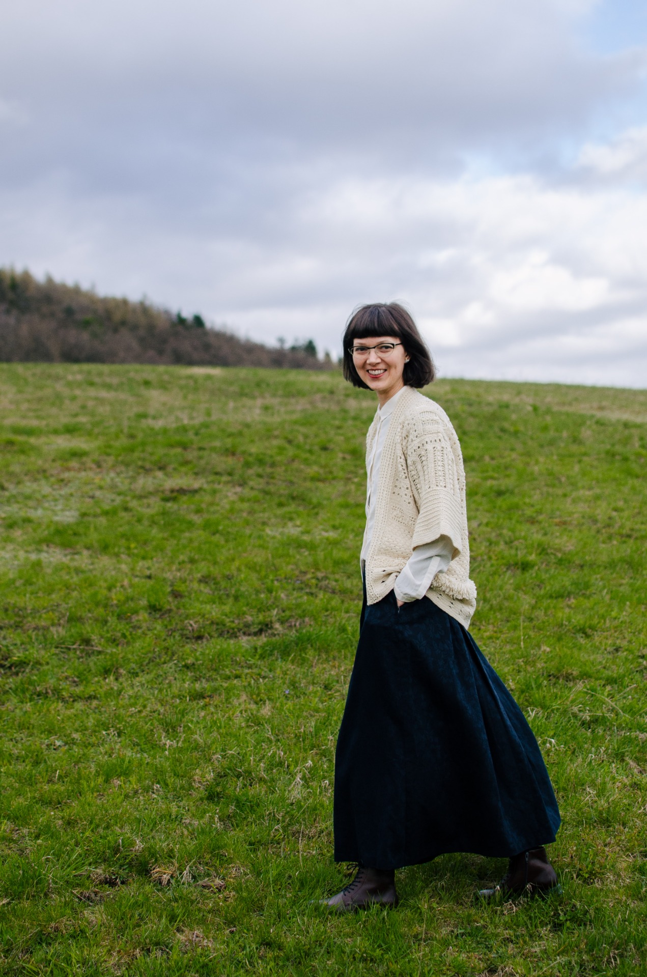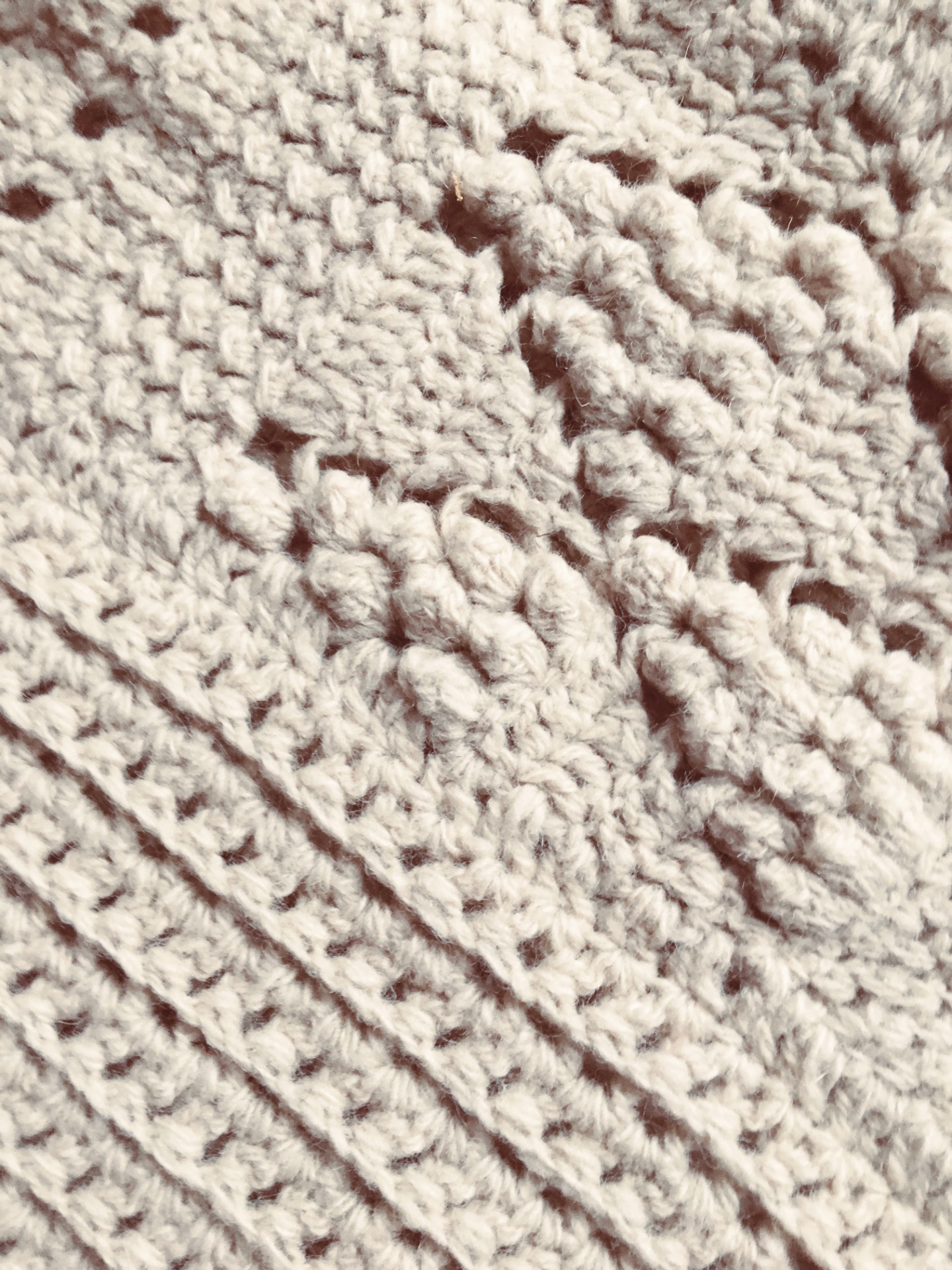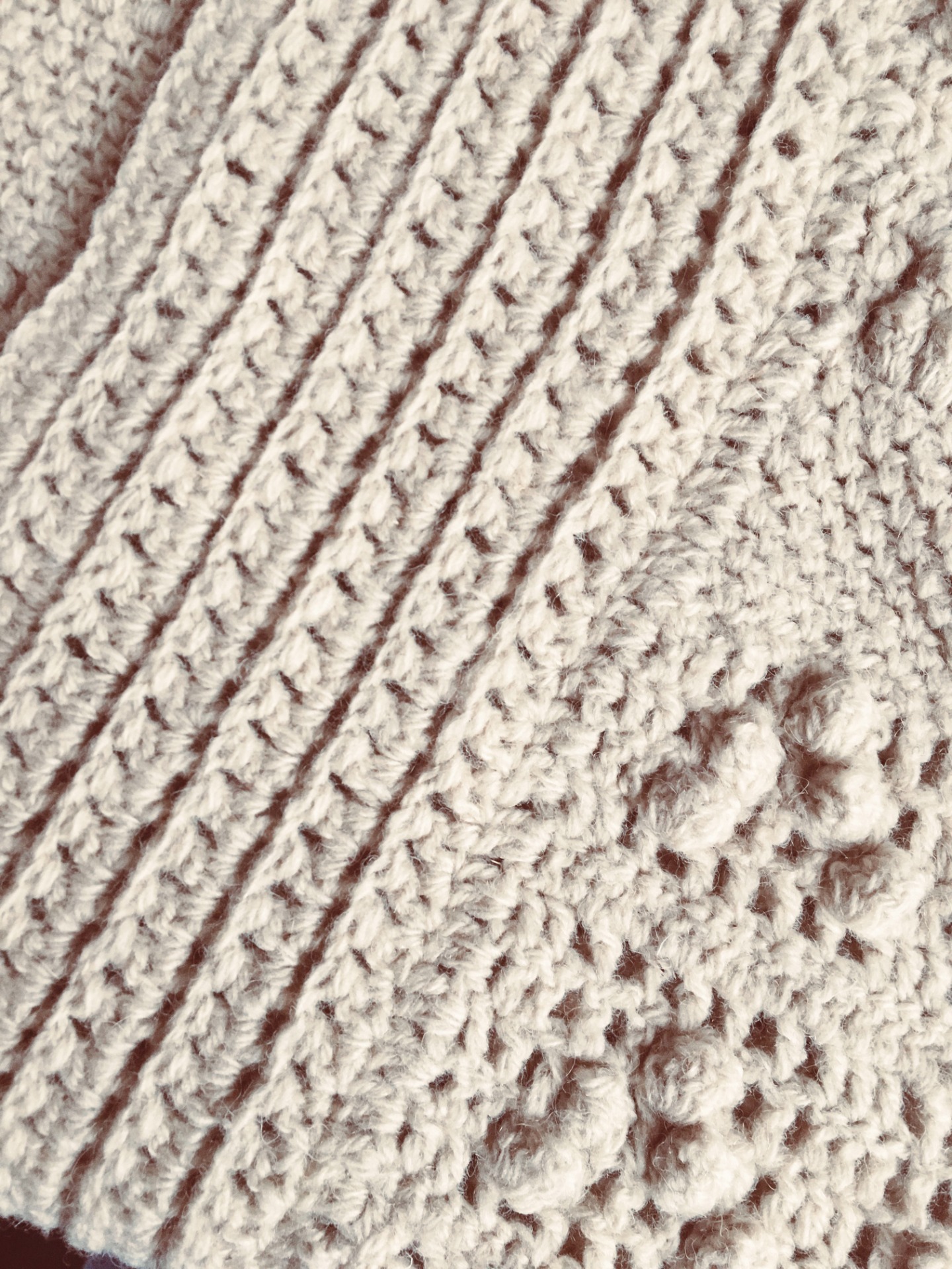 Kardigán je háčkovaný z dvojnitky od ovečiek zo stáda pani Milany z Močiara a z Farmy Na Háji. Spriadané v Poľane Lučenec a vo Vlnárskej Manufaktúre Senohrad.