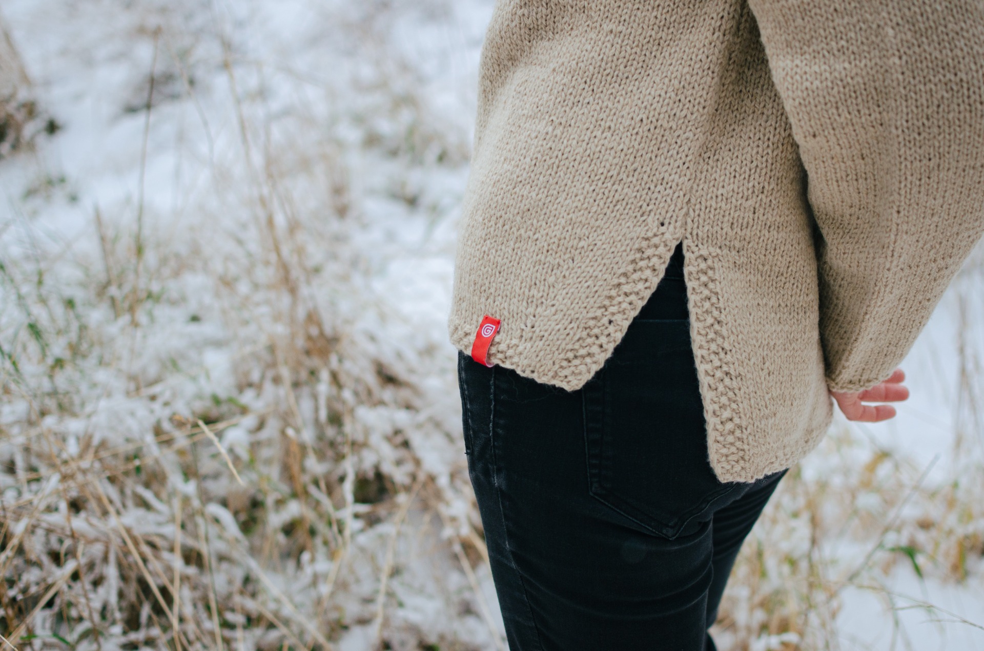 Všimnite si jemné detaily svetra MILANA – má rozparok dole na bokoch, zadný diel trochu dlhší – pekne robí štíhlu líniu, golierik vyhrnutý, ukončenie rukávov – vzor hrášok a dole červené logo GUBAŃA.
